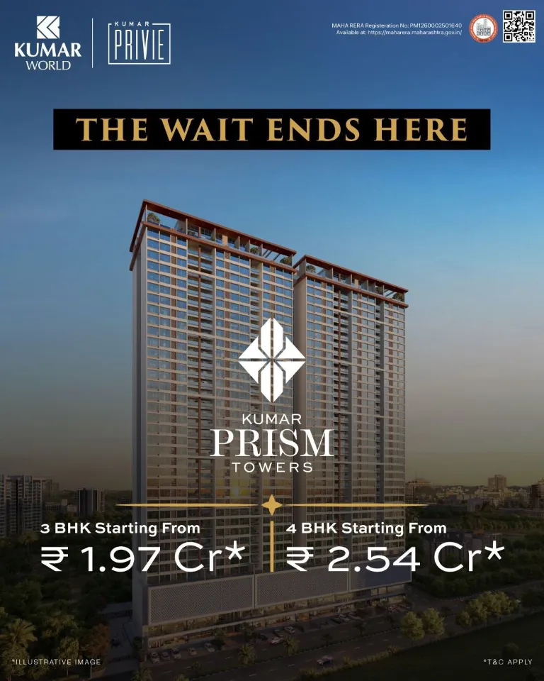 Kumar Prism Towers at Mundhwa–Magarpatta Road, Pune is a premium luxury residential project by Kumar World, designed for those seeking spacious and elegant high-rise living. Developed on a 2.5-acre land parcel, the project comprises 2 iconic towers with G+4P+28 floors, offering luxurious 3 BHK and 4 BHK premium residences. These thoughtfully planned homes feature extra-large living spaces, private sundecks, and panoramic city and river views, ensuring a refined lifestyle experience. The project boasts 50+ world-class lifestyle amenities spread across multiple levels, catering to fitness, leisure, and relaxation. Strategically located near Amanora Park Town, Kirtane Baug, and Magarpatta City, Kumar Prism Towers enjoys seamless connectivity to EON IT Park, major business hubs, reputed schools, hospitals, shopping malls, and well-developed public transport networks. This luxury high-rise project offers the perfect balance of comfort, connectivity, and contemporary living in East Pune. Read More